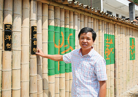 昨日上午,记者走进长坑村,远远的就被村口的竹制品吸引了:村口用古旧的簟和毛竹编织的一块景观墙,上面写着古体的“相约”两字;旁边一人多高的竹墙,则写着“厚德载物”四个字;路边、河边都是简约古朴的竹篱笆。所有这些,都是53岁的李夏洋带领村民动手建成的。李夏洋是长坑村支委,年轻时候担任过村团支部书记,喜欢古诗词,也写得一手好字。小时跟亲朋好友写信,都是用毛笔字写的。这次在竹篱笆和竹制景观墙上写字,当然非他莫属了。