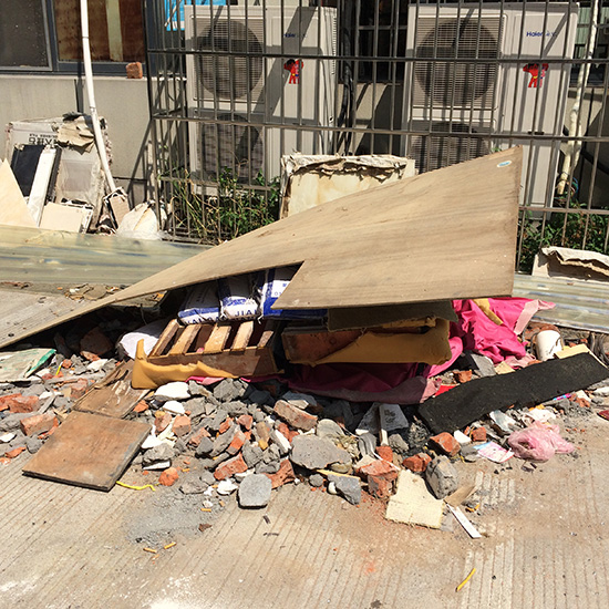 距离不远的水木年华足道馆门口,有成堆建筑垃圾未及时清理,存在安全隐患,也影响了市容市貌(下图)。