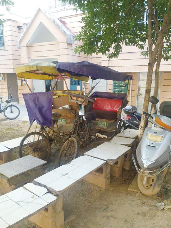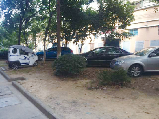 湖都花苑小区内的一处花坛,一些住户用建筑废料堆积成可供休憩的座位,中间还被黄包车、电动自行车和摩托车堵得严严实实。杂乱无章,影响美观。花坛的另一头,停着好几辆私家车。植被稀疏,地表沙化,严重影响了小区绿化环境。