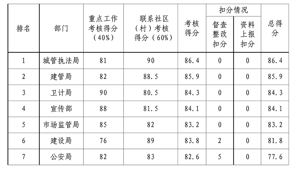 根据《关于印发嵊州市创建国家卫生城市工作“网格化”管理考核办法(试行)的通知》(嵊市委办发〔2016〕77号)、《关于印发嵊州市创建国家卫生城市共建活动社区(村)重点工作责任清单的通知》(嵊市委办发〔2016〕33号)和《关于城乡环境整治提升夏季大决战考核办法的补充意见》(嵊市委办传〔2016〕99号)文件精神,市创卫考核工作小组于8月28日-29日对全市建成区47个社区(村)和7个重点职能部门的创卫工作进行了实地检查考核。现对考核结果进行通报(问题清单和照片另附下发),要求各单位于9月9日前完成整改,并将整改情况报市创卫办。市创卫办将进行跟踪督查,对未按时完成整改任务的责任单位将提交市“两办”给予通报。
