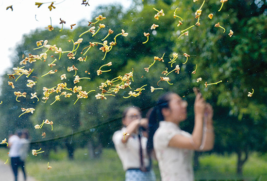 这几天,走在黄泽百年桂花园里,不时可闻到弥漫着的桂花清香。据悉,由于气候原因,今年各地桂花的花期比去年有所推迟。图为市民在赏桂。