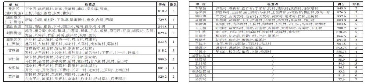 根据《嵊州市城乡环境整治提升夏季大决战考核办法》(嵊市委办传〔2016〕95号)和《关于城乡环境整治提升夏季大决战考核办法的补充意见》(嵊市委办传〔2016〕99号)等文件精神,9月18日至22日,城乡环境整治提升夏季大决战各考核组分别对各乡镇、街道及相关部门开展了检查考核。现将结果公布如下: