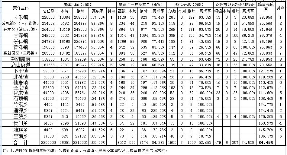 嵊州市“违法建筑大整治行动”一周完成情况综合排名表