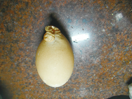 贵门乡贵门村朱月松家的一只母鸡前不久生了一个怪蛋:重60克,一端是正常的鸡蛋,另一端却多了一根短小的尾巴,蛋身上还有几条细小的裂缝。主人说,这只母鸡已经饲养了3年,这样怪异的鸡蛋,还是第一次生下。