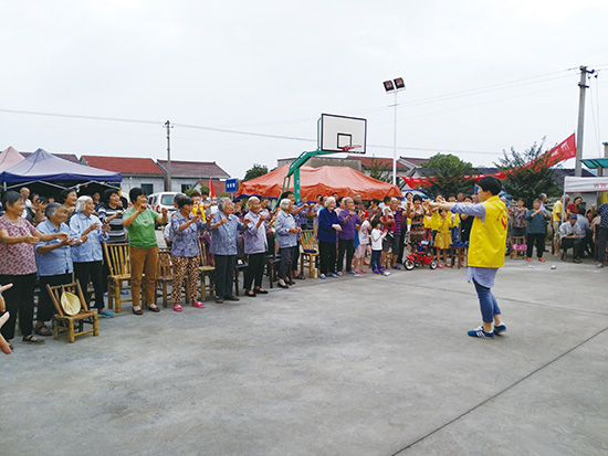 10月7日,市慈善阳光志愿者服务队一行前往崇仁镇宋家墩村,开展重阳节爱心文化进礼堂活动。志愿者为老人理发、修脚、量血压,表演文艺节目,还为当地80岁以上老人送上慰问品。图为志愿者教大家表演手指操。