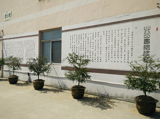 学校的公共区域布置了很多与书院文化相关的文字与图画,在校门口、教学楼墙壁、寝室楼墙壁、学校操场上的国学经典,处处都是“读”的教育的主阵地。