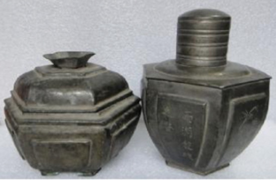 自古至今都公认锡罐为储装茶叶的最佳器皿(现代茶叶包装也用锡箔)。它既可使茶叶长期保鲜,又有效地避免营养的流失和口味的变化。此两件锡器当为晚清民间茶叶罐,体呈六棱,寓六合之意。低罐用“地托天”的盖式,高罐用“天包地”的盖式,寓古代做官模式,构思极为巧妙。此件由市收藏协会陶如东提供。