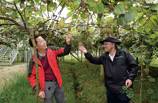 图为竺君灿(左一)在江西萍乡的果园里,正在采摘成熟的猕猴桃,这是从嵊州本土的猕猴桃品种,因气候原因,推迟成熟上市反成了当地时鲜水果。