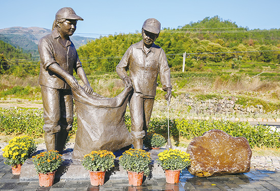 近日,在下王镇上店村村口,多了一个以村嫂为主题的小公园,绿树成荫,芳草依依。这里,除了有介绍村嫂的展板,还有4对形象各异的村嫂雕像,展示了上店村村嫂志愿服务队“治水保洁、尊老爱幼”的形象。