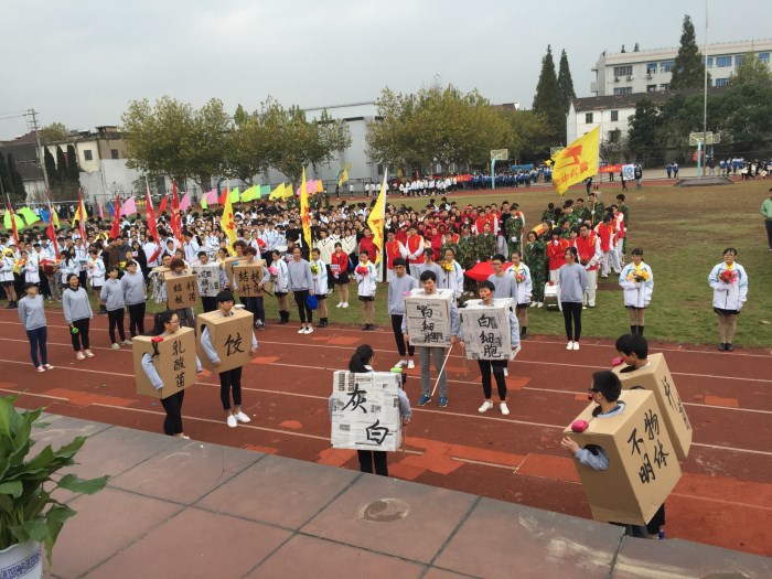 黄泽中学的体育节开幕式一向美名远播,以“精彩纷呈,富有创意,年年不雷同”获得全市师生的称赞,已然成为一道亮丽的体育节传统风景,充分展示了泽中学子团结拼搏的团队精神、无限的创意以及浓厚的师生情,体现了学校文化建设的丰硕成果和奋发向上的精神风貌。在本次开幕式时,伴随着激昂的运动员进行曲,英姿飒爽的国旗手手举国旗庄严入场,仪仗队、鲜花队、彩旗队簇拥而至,紧随其后的是各具特色的30支学生方队。他们以整齐的队伍、坚定的步伐、响亮的口号、饱满的热情、精彩的演绎,依次通过主席台接受检阅。整个开幕式过程有序、充满激情,学生方队表演声情并茂,形式多样,风格迥异,可谓是“每年不重样”,“没有做不到,只有想不到”,全场高潮迭起、掌声如雷,为在场师生、家长带来了一场绝佳的感官盛宴,堪比一场大型文艺汇演。其中由实力派班主任韩晓老师亲自上场的舞蹈惊艳全场;各种男版妖娆舞曲、反串迎来全场轰动,艳压群芳,可谓是“为了班级,我豁出去了”;舞台剧、俄罗斯方块等等创意连连,更有“大肠杆菌大战结核菌”生物普及剧获得一片点赞。同学们纷纷感叹:“没有最拼,只有更拼,我们都开始筹划明年的节目了”。