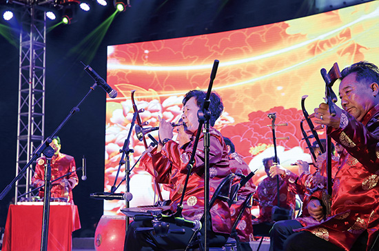 《庆丰收》是一个非常喜庆的节目。四大锣,五小锣,唢呐,笛子,大胡,中胡,高胡和二胡等十来种乐器吹响的时候,连空气都热乎乎地沸腾起来。民乐队负责人是50多岁的魏喜明。她是国家级非遗传承人(嵊州吹打)尹功祥的儿媳妇。
