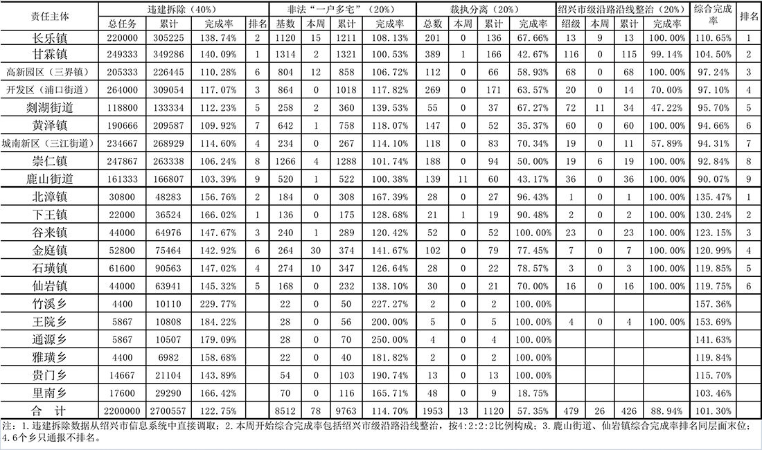 嵊州市“违法建筑大整治行动”一周完成情况综合排名表