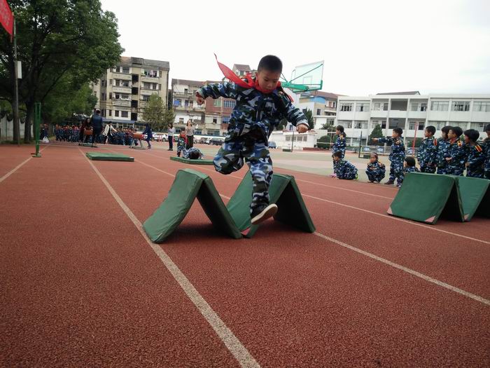 围绕“少年立志,加强国防,勤学苦练,报效祖国”这一校训,今年的军训推陈出新,用游戏代替以往的基本军事训练。通过游戏,培养学生的责任感、使命感;培养,密切合作,克服困难的团队精神;培养服从指挥、一丝不苟的作战态度。此次“军训活动月”分两大游戏主题:一是“翻山越岭运送军粮”。主要针对低段学生,设计了“爬雪山、穿火线、越山岭”三个作战场景。二是“齐心协力运情报”。主要针对高段学生,设计了“情报大速递、无敌大坦克、巧过地雷阵”三个军事游戏。为了让军事游戏更具真实性和趣味性,激发孩子的使命感。活动前,指挥官就介绍了相应的历史背景,以故事为引子,以游戏为阵地,让学生在活动中体验军人的意志品质,重温那一段光荣艰难的岁月,让学生真实体会“我是一个兵”的光荣和责任。