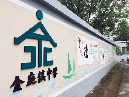 为营造积极向上的学习环境,创设充满活力、积极进取的文化氛围,让学校成为学生温馨而有个性的家,该校十分重视文化墙建设。一进校门,墨绿色的校标赫然呈现在眼前,整面文化墙突显了“崇德、尚能、修学、敦谊”的校训。校标由图形及文字两部分组成,为该校竺正梁老师设计、竹颖颖同学书写。图形上半部分由小写字母“j、t”变形而成,是汉字“金庭”的拼音首字母,下半部分是“金”字的变形,底部是“金庭镇中学”毛笔楷书。整个造型犹如江南特色古民居,寓意金庭镇深厚的文化底蕴;上面圆点寓意学校教育事业犹如旭日东升、蒸蒸日上;楷书“金庭镇中学”表示传承王羲之书法艺术。图形色彩设计为绿色,寓意为绿色学校,充满生机,彰显学生们的青春与活力。整体标识寓意弘扬中华传统文化,稳步提升学校教育。