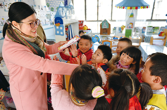 12月7日,罗星幼儿园的老师正向小朋友赠送孝心历卡。