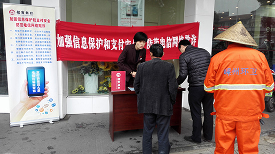 为提高公众风险意识,防范电信网络诈骗,12月13日中午,招商银行嵊州支行员工利用休息时间在支行门口广场边向广大群众进行防电信诈骗宣导工作。