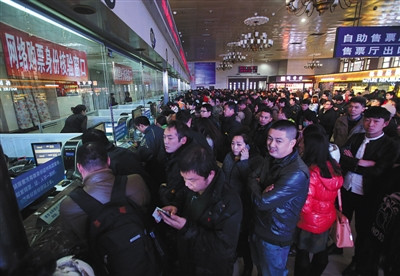 2015年12月7日,北京站售票大厅乘客在售票窗口排队买票。2017年1月起旅客在出站前丢失火车票均可挂失补办。
