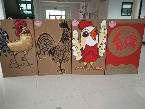 制作现场俨然一副“吉祥鸡加工厂”,各种颜料的吉祥鸡,上面五彩缤纷的粘贴这纽扣和各种材质的纸做出来的鸡蛋。老师制作身体,孩子粘贴辅助物。每个班级都尽情发挥着想象力和大胆的创造力,真是八仙过海各显神通。经过一番精雕细琢的剪剪贴贴刻刻画画后,在她们的精心制作下一个个独特的“吉祥鸡”诞生了,为鸡年新年增添了许多亮丽的风景。瞧!一个个宛如买来般栩栩如生的吉祥鸡展现在大家眼前,“中国风的刻画鸡”“五彩缤纷的手工鸡”“吉祥如意的布金鸡”“调皮可爱的纸片鸡”等作品让人目不暇接。最后大家欣赏着制作好的吉祥鸡甭提有多高兴啊!整个幼儿园处处洋溢着鸡年前夕的欢乐!