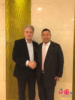 中国网中国视窗讯 3月14日,浙江嵊州诗人、资深媒体人王林受乌克兰驻华大使焦明·奥列格及夫人特蒂安娜女士邀请,在北京参加中乌建交25周年交流活动。活动期间,王林受到了乌克兰第三任总统尤先科的接见,并向总统尤先科赠送了嵊州特产领带作为礼物,同时王林向总统尤先科介绍了自己家乡浙江嵊州近年来的发展,并真诚的希望总统尤先科先生有机会能够到嵊州考察调研。