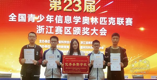 2017年第23届全国青少年信息学奥林匹克联赛中学校再创佳绩。金伟杰、史佩天、沈致远、林 泽4位同学获得全国联赛一等奖(嵊州市共5人),丁志灏等9位同学获得全国联赛二等奖(嵊州市共13人)。
