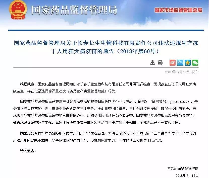 7月15日,国家药监局发布通告,根据线索,国家药品监督管理局组织对长春长生生物科技有限责任公司(简称“长春长生”)飞行检查,发现该企业冻干人用狂犬病疫苗生产存在记录造假等严重违反《药品生产质量管理规范》行为。通告称涉事的疫苗尚未出厂和上市销售,已被全部控制,已对相关违法行为立案侦查。国家药监局要求吉林省药监局收回长春长生的狂苗GMP证书。