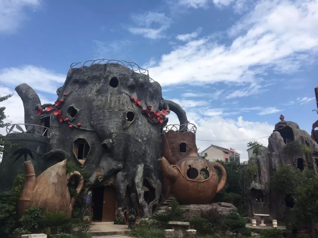小小的蒋林头村,藏着世界最大的茶壶建筑组合群——吴特豪五壶艺术馆。此艺术馆是仿大自然的松桩、梅桩、翠竹、冬笋、石榴造型的五把茶壶。五壶相互连接贯通,神机组合,形成了一座独特风格的极品工艺建筑群。