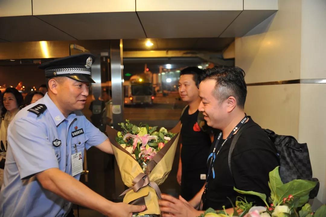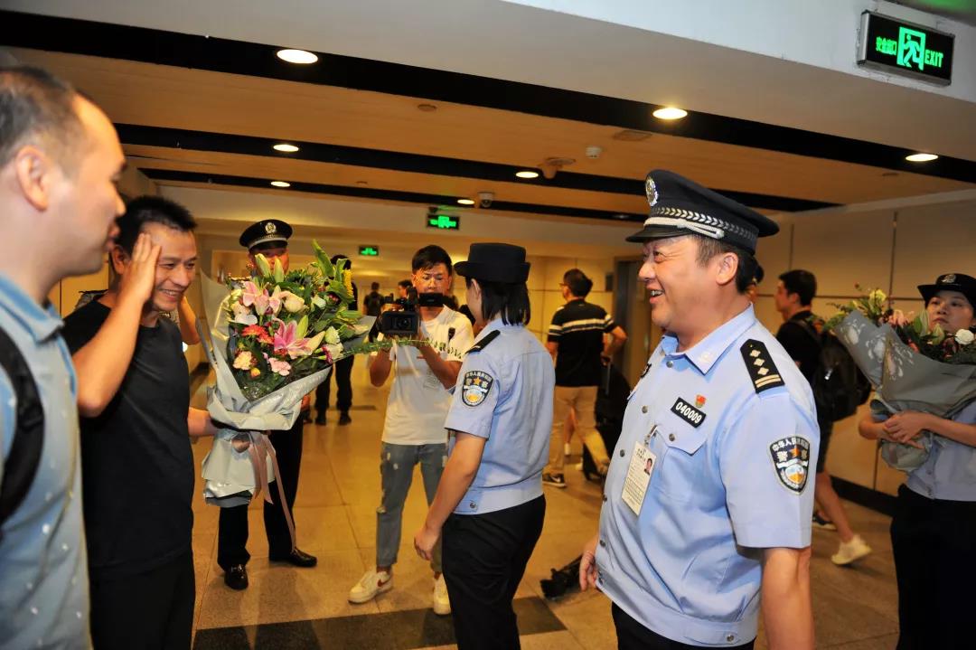 在他们下车那一刻,掌声顿时响起!绍兴市公安局党委委员、副局长章松青,嵊州市副市长、公安局长骆卫星等领导为了第一时间给民警们送上鲜花和掌声,在机场足足等了4个小时。