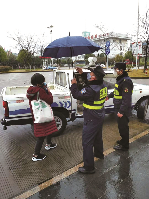 姚大妈连忙转身回到楼上整理东西。口罩、奶粉、奶瓶、尿不湿、包、伞……一样也不能落下,要做好住院的准备。还没等她清点好东西,门铃响了,“请问,您家有宝宝要去看病吗?”只见两名城管已经站在了门外,原来物业公司的人把此事告诉在翡翠东城值守的嵊州市综合行政执法局开发区中队的张毅,张毅觉得此事紧急,就向队长姚军良作了汇报。副中队长周行收到消息,就带着他的队员金立忠匆匆赶来了。