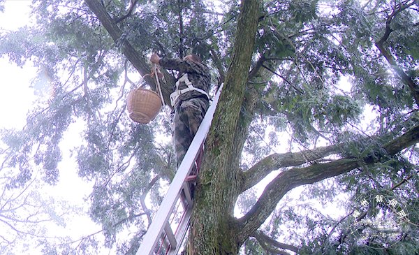 一架蜈蚣梯、一把竹钩、一个竹篮、几根绳子,是采摘香榧的必备工具。李王喜腰上捆着安全绳,穿梭在十几米高的香榧树上,把采下来的青果扔到篮子里。这些年来,他在采摘上已是驾轻就熟,尤其对安全问题,更有自己的想法,“摘香榧安全最重要,安全绳是必须系的。”李王喜说,老香榧树的枝干比较松脆,容易断,所以要特别留意。有些老香榧树,看看很大,实际上已经霉变,如果安全带用上了,安全系数就会高些。