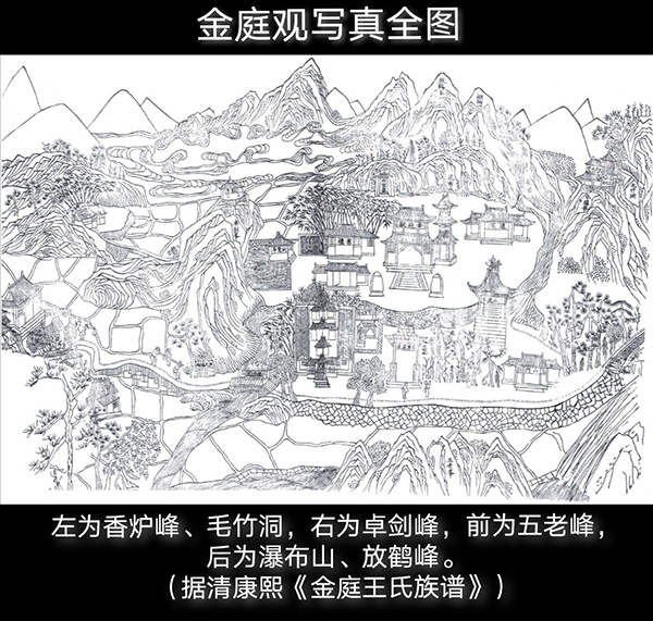 ②金庭山四至清楚。金庭山在孝嘉乡(今金庭镇)。东北至撞天岗、东至大湖山(金庭之东峰)、东南至陈公岭,南界五老峰,西界白龙潭,北界元宝湾。金庭观四围地貌亦清晰明了。依清康熙《金庭王氏族谱》所载金庭观写真全图(见图1),东临(小)香炉峰和毛竹洞(即金庭洞,其北门在小香炉峰顶);西依卓剑峰,南(前)为五老峰,北(后)枕放鹤峰。置观后,书楼在观之西北,墨池在(三清)殿之东北。依前所述,金庭洞北门在(小)香炉峰顶,说明毛竹洞与(小)香炉峰之间极有可能存在山体中空现象,且彼此相通,这与《剡录》等方志及裴通记中所述相合,也与金庭山一带的地质地貌相契。