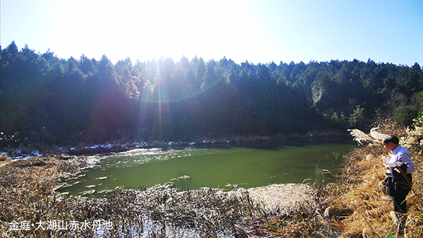 事实上,据当天实考和测量,赤水丹池位于今金庭镇大湖山主峰山脊西侧,等高线海拔870米,已形成约1500平方米的水体。据当天陪同我们的向导、毛勇村水管员毛裕堂介绍,金庭一带乡民俗称丹池为龙潭,潭体原来稍小,潭心为一豆腐桶大小的泉眼,深不可测,泉水汩汩,四时不绝,从未干涸。西侧出水口处,水视之为赤色,勺之则清洁如镜。1960年代,人们曾筑高西侧出水口以蓄水保供,使丰水期水面可扩大一倍,至今仍为毛勇村民饮用水源。丹池整体上呈不规则六边形,岸线东西长约50米,南北长约30米,其东南侧岸线与今嵊新界址直线距离约1.1千米。丹池周围云杉参天,杂木灌木与野藤荆棘间生,池边长满芦苇,属天然次生生态系统(见图2:赤水丹池方位图;图3:赤水丹池实景图)。另据考,迄今亦未见典籍方志和乡里民间有称大湖山为“古金庭山”的记载和传言,此说为新近杜撰。