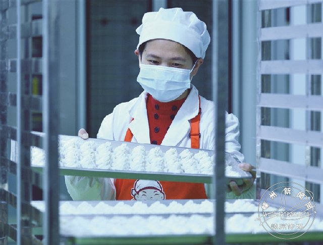 市小吃行业协会提供的数据显示,近几个月来,我市通过SC认证的小笼包企业达21家,小笼包小作坊(私房口味)近百家。嵊州小笼包网上订单平均每日超过100万只,初步估计全国有10余万人在家中品味从嵊州订购的小笼包。图为市越鲜食品有限公司工人工作场景。
