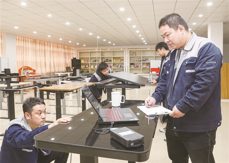 位于三江街道的绍兴市耐特驱动科技有限公司,是一家专业从事智能健康升降桌研发、生产、销售、服务于一体的创新型出口企业。该公司销售网络遍及全球30多个国家,与美国、 加拿大、 英国、 芬兰等国家的100多家企业建立了长期战略合作关系,在受全球疫情影响的大环境下,今年更是逆势增长,产值在前两年的基础上翻了3倍之多,目前出口额已超1000万美元。图为公司技术人员正在对产品进行检测。
