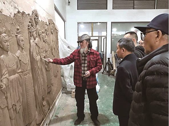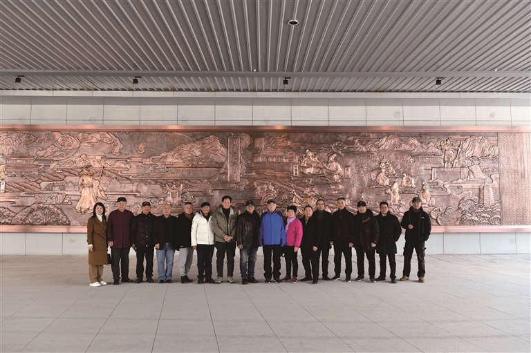 2021年12月22日上午,何国门与新昌两位文化专家也到壁画安装现场,观摩指导壁画细节微调工作,尤其是对部分景点名称印章篆刻不够规范等问题当场提出了解决方案,要求壁画施工安装现场负责人弘扬工匠精神,尽快完成细节瑕疵修正,确保壁画真正成为经得起业界审视、大众认可的艺术精品。