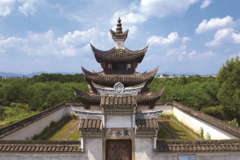 环水亭位于甘霖镇黄胜堂村北。《吕氏宗谱》记载,环水亭创建于清乾隆壬子年(1792),民国三十四年(1945)重修。现存建筑保持清中期风格。 亭坐北朝南,平面呈正方形,高三层,重檐攒尖顶。内设楼梯,第二、三层四面开窗,登亭可凭窗远眺,第三层顶部施八角形藻井。亭四周留有空地,并建围墙。此亭造型美观,建筑雅致,是嵊州市仅存的两座亭阁建筑之一,1988年公布为县级文物保护单位。 裘坚钢 摄