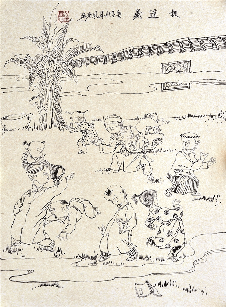 宓风光的作品《捉迷藏》表现了越乡孩子们在民国时期的游戏情景。这是一群四到八岁的幼儿,在一个紧靠花墙的私家花园内活动。作者以扎实的写实功底,生动有趣地刻画了幼儿们的众生相。参加游戏的是一群富家的子女,穿着都比较整齐,动作可爱而调皮。那位蒙着双眼的“瞎子”装扮者,穿着长袍小马褂,戴着瓜皮帽,半蹲着身体,迈开双脚,伸手探摸,五个小手指轻轻抖动着,似在吸收动态信息,朝前方缓缓而来。其余几个孩子则机智敏锐地围绕着瞎子,演化出各种生动而调侃的动作:有的虎虎生风地跑到前面,扭动着腰肢,伸出手掌,回头朝着他揶揄地调笑;有的躲到他的背后,装模作样地做着各种鬼脸来逗乐;有的通过发出一些怪声,来引诱瞎子,让他循声探摸扑空;有的则跑到芭蕉树后边躲起来,探出半个小脸,窥看着瞎子出洋相;有位刚满四岁的“小调皮”,竟蹲下身子,张开四肢,扭头朝着他调侃地讪笑,不料后面的开裆裤张开,竟露出了小屁股;最惹人注意的是那位扎着羊角辫、穿着花长袍的小女孩,她大幅度地摆动双臂,跳跃双腿,唱着小曲,宛如西方的迪斯科舞,吸引着瞎子的注意。《捉迷藏》画面向我们展示了一幅生气勃勃的幼儿在游戏时机智敏锐、萌态可掬的活泼场景,令人过目难忘。