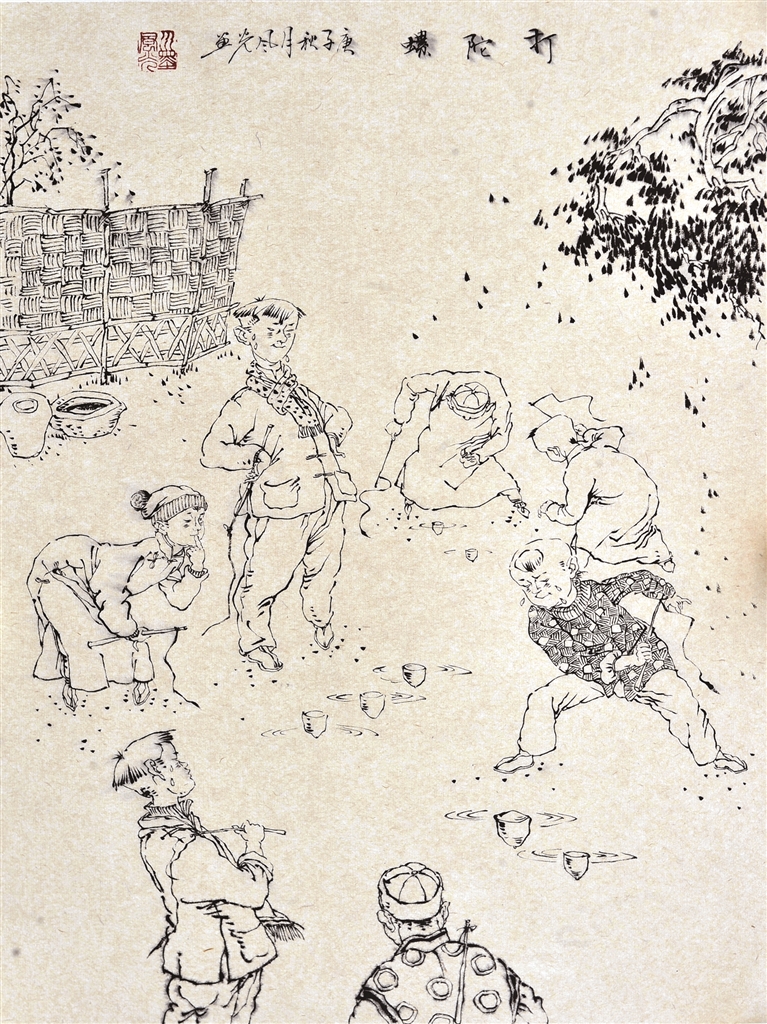 宓风光的《打陀螺》就表现了孩子们在晒谷场比赛的情景。越乡的孩子们经常进行打陀螺比赛,这是一块平坦而硬朗的“三合土”地面,大家玩得热烈而有生气。一只只陀螺,在皮鞭似的陀螺绳抽打下,打得溜溜转。比赛分三个层面,一是比赛谁的陀螺转得时间长;二是比赛陀螺的碰撞,谁的倒下了,谁就输了;三是比赛陀螺转圆圈,倘若能来回地转大圆圈而不倒,那是高手了。画面中,那位穿着花夹袄翻着绒线衣领的男孩是个打陀螺的高手,他摆开弓步,抽动得皮鞭啪打啪打地响,清脆、豁亮,把眼前的陀螺打得溜溜飞转。而他前面的对手也不示弱,抽打得陀螺快速旋转后,把鞭子甩在肩上,镇定自若地站着。两人真是旗鼓相当,难分输赢。陀螺的分量虽然小,一旦使劲打起来,运动量可不小,你看,两个孩子的脸上都大汗淋漓了。左上方的两个孩子也非等闲之辈,两个人鞭打三个陀螺,都运转得非常顺利。中间那位身材长得高大、颈围围巾的男孩,双手插腰,看着眼前的陀螺飞转,脸上露出胜利的自信。打陀螺的动作有一定的难度,需要一定的技巧,倘若抽打陀螺的部位不对,陀螺便会像喝醉了酒一样,摇摆晃晃地转了几下,倒在地上不动了。画面右上角的两个孩子便是打陀螺的初学者,他们在学打中总结出经验,打陀螺应该注意陀螺的平衡,弯下腰,腕用力,使巧劲,用鞭子抽打陀螺的中间,才能把陀螺打得溜溜转。