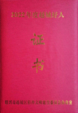 2023年1月16日,受绍兴市越城区精神文明建设委员会的委托,塔山街道召开2022年度“越城好人”颁奖仪式,周薇薇同志被授予“越城好人”荣誉证书,身披绶带上台领奖。