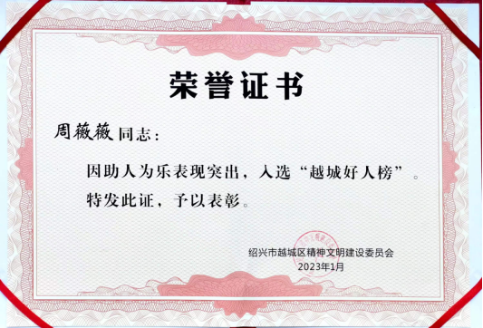 2023年1月,周薇薇同志入选“越城好人榜”