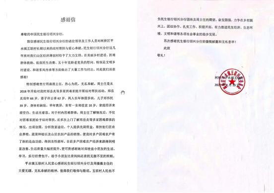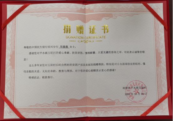 周薇薇同志像雷锋那样热心为民,无私奉献,为美丽乡村建设、山区困难家庭结对帮扶默默奉献爱心。2022年4月,绍兴市柯桥区平水镇五联村村党总支书记、村委主任特意打来电话,同时该村特意向民生银行绍兴分行写来一封《感谢信》,感谢周薇薇主任从2018年开始对该村郑岳炎等多家困难家庭开展结对帮扶,并多次到平水山区上门了解,个人提供资金帮扶他们在养殖、种植方面逐步走出困境。“更可贵感谢她对郑佳宜小朋友的生活、学习,实行经费包干,给予小朋友比亲妈妈还亲的无微不至的照顾”“平水镇五联村人民衷心感谢周薇薇主任的大爱无疆,无私奉献的精神。”