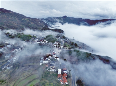 山美、水美、人居美是山村记忆与乡愁元素,位于下王镇的泉岗村,依托生态治理和美丽乡村建设,使山村风景更加诱人,文化旅游增加色彩。图为昨日在下王镇泉岗村航拍的云海美景。