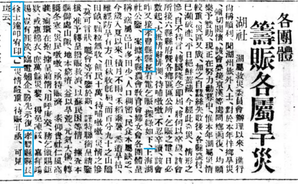 新闻报道中提及湖州1934年夏遭受的严重旱灾。徐士达时任孝丰县县长,恰逢大灾,心系百姓的他,为民请命,特向湖社宥电乞赈,以苏民困。正如报道结尾所言:“灾情严重,待赈孔亟,可见一斑云。”