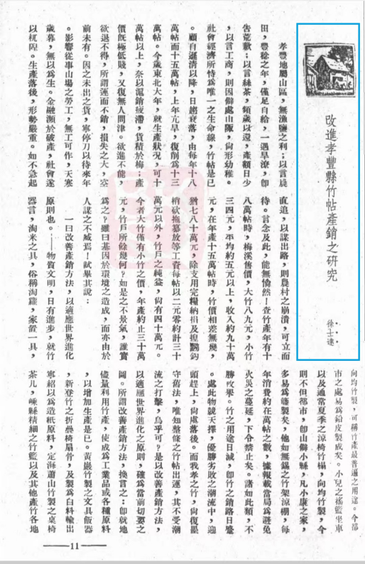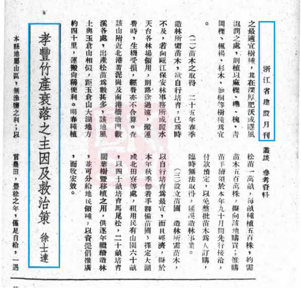 另两篇由徐士达撰写的文章均与孝丰(安吉)竹产业有关,分别为刊载于《浙江合作》上的《改进孝丰县竹帖产销之研究》〖注7〗和《浙江省建设月刊》上的《孝丰竹产衰落之主因及救治策》〖注8〗。二文主旨和内容相同,尤其是救治策一文,在深入分析孝丰竹产衰落主因的基础上,详细地提出了救治之策。全文洋洋四千多字,俨然主政孝丰、力扫积弊、惠及竹户、振兴竹乡的施政总纲。文章指出,竹帖作为“孝丰社会经济所恃为唯一之生命线,自逊清以降,日趋衰落”的实际,“虽曰基因于环境之造成,亦由于人谋之不臧”,然后具体分析了孝丰竹产业“产销方法落后”“运销市场被沪商操纵垄断”“地产竹资源品质退化”“缺乏周密之行业保护组织”等四方面衰落的主因,针对性地提出“严密竹户组织,调整保护产销机构,设立林业合作社”以及“县政府加强领导和指导”的救治良策。最有效的措施,应当是在原林业联合会丧失管理效能的情况下,徐士达直接领导并成立孝丰县林业合作社,健全组织机构,加强内部团结,主张公平正义,革除恶习积弊,使孝丰的竹产业重新由衰落无序走向有序发展。